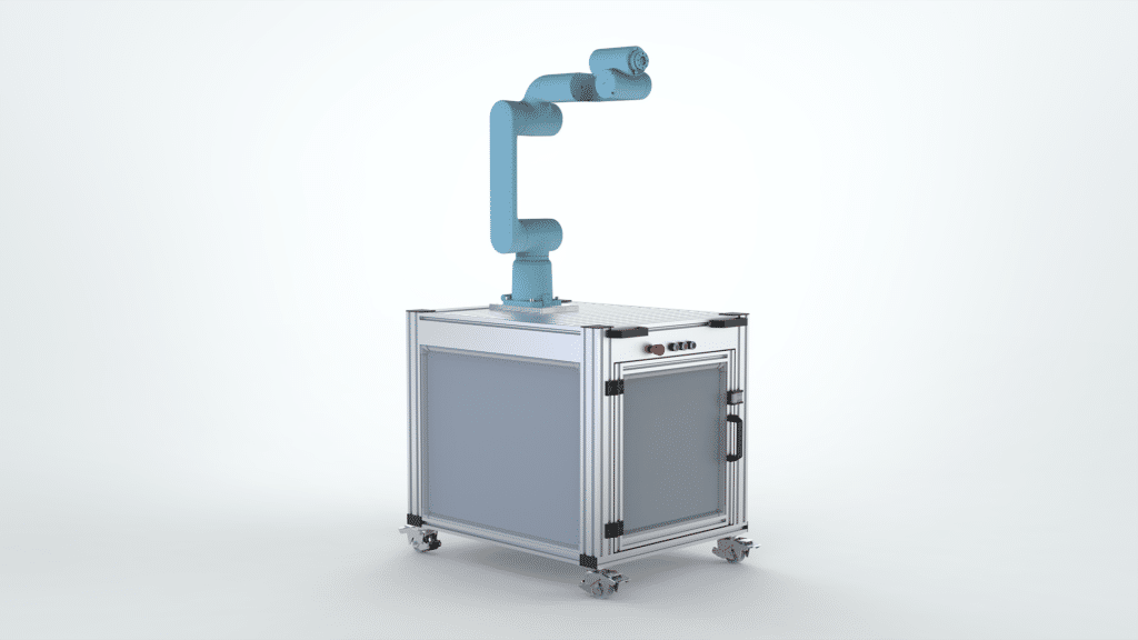 Mit der Cobot-Station lassen sich Maschinenbedienung, Assemblierung, Klebeapplikationen oder einfache Pick & Place Aufgaben schnell in Angriff nehmen. Anwendungsspezifische Bauteile wie Werkstückhalterungen, Sensoren oder Taster lassen sich problemlos an den Profilnuten anbringen. Dank Stauraum für die Steuerungselemente sowie Heberollen mit Feststellfüßen gewährleistet der Unterbau höchste Mobilität für individuelle Einsatzmöglichkeiten.