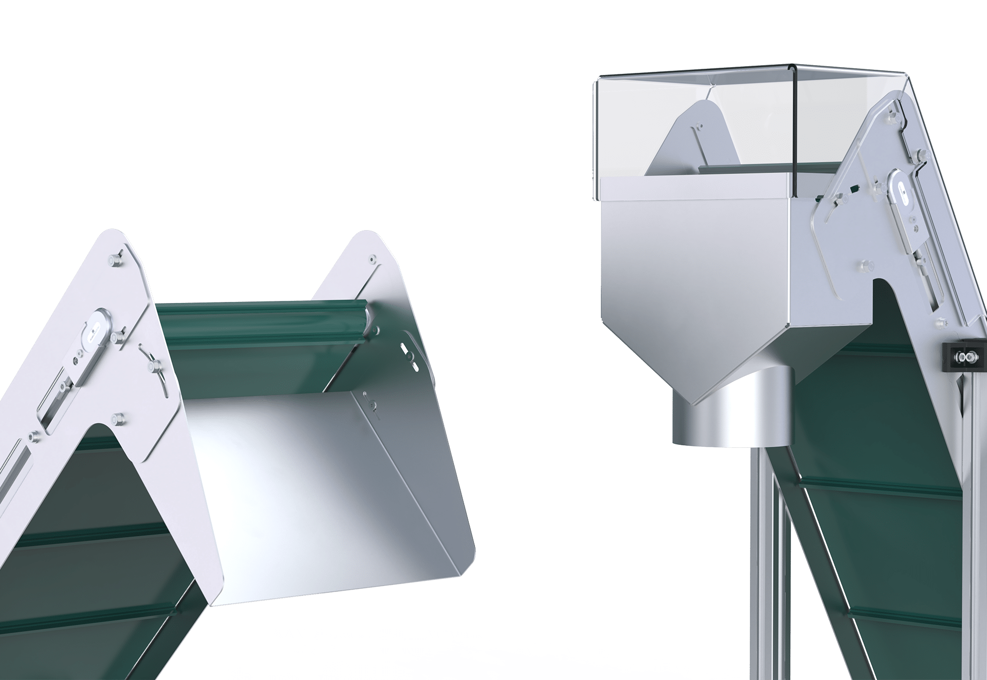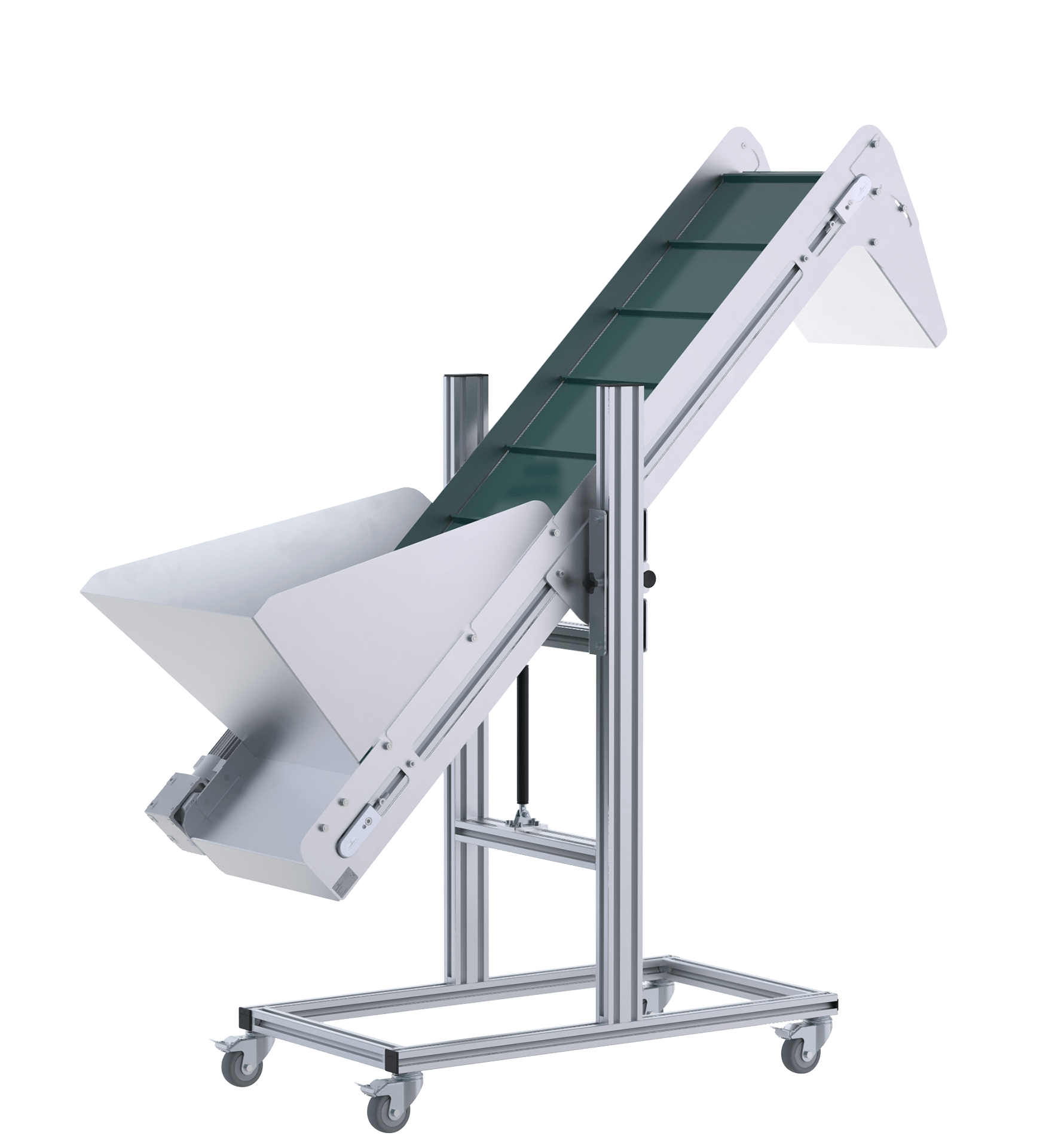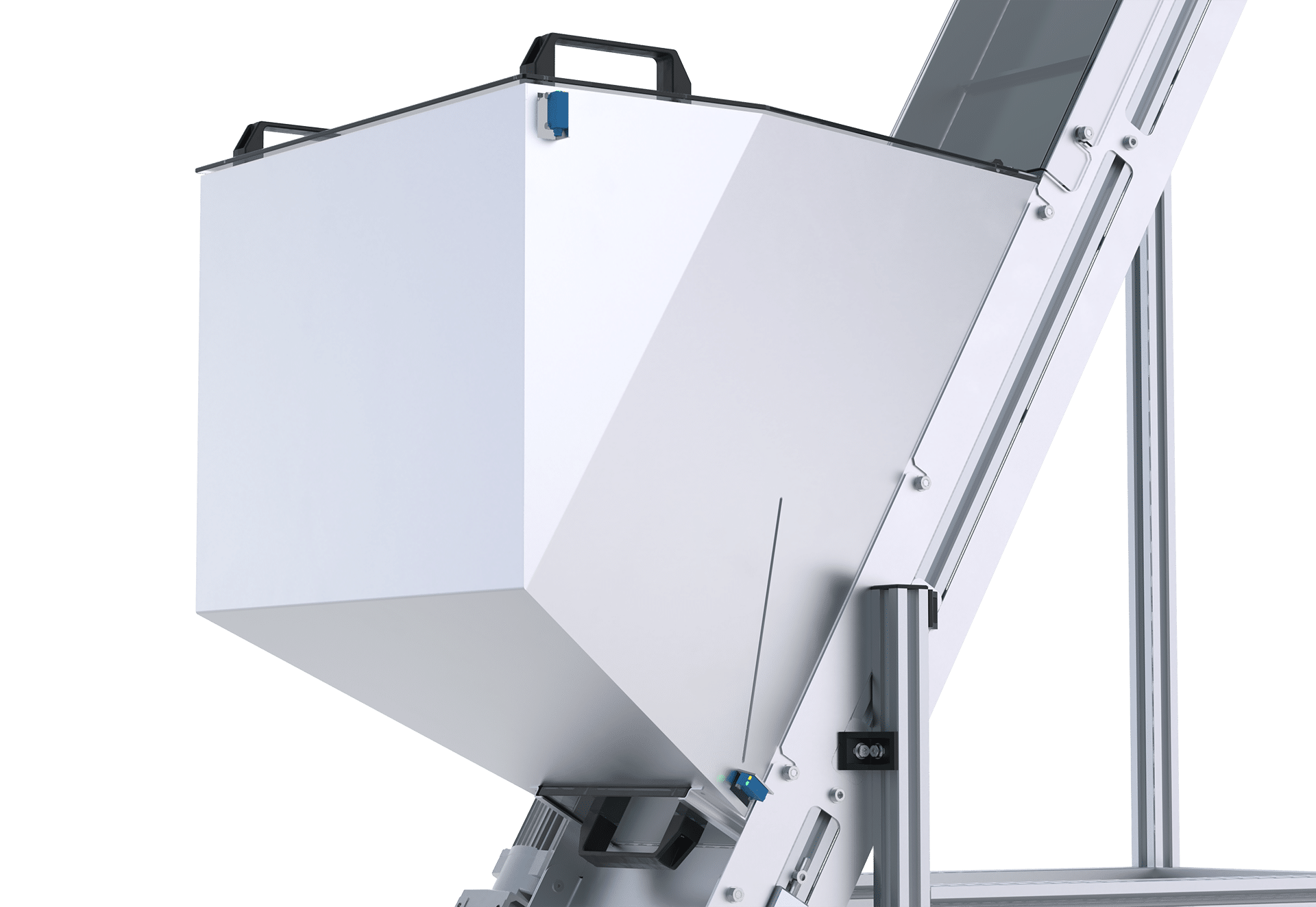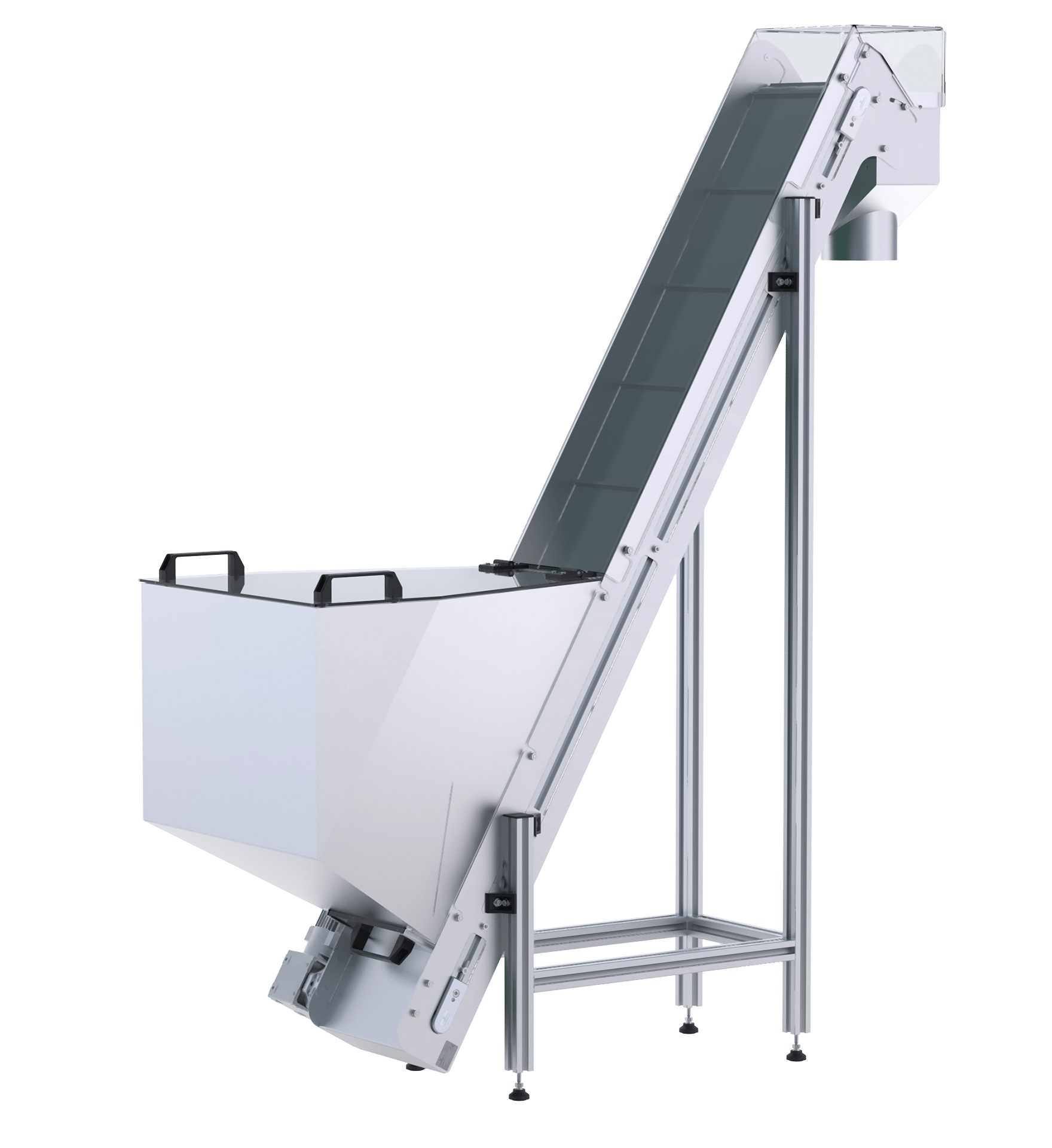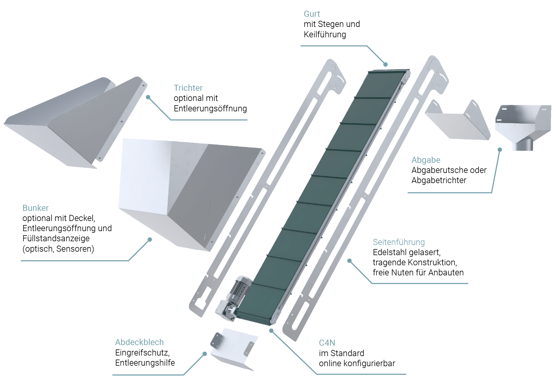 Mit durchdachten und multifunktionalen Anbauteilen verwandelt sich der bewährte Robotunits Gurtförderer C4N in einen Bunker- oder Trichterförderer mit vielfältigen Anwendungsmöglichkeiten: beispielsweise als ideale Lösung für das Beschicken von Maschinen mit Schüttgut oder auch als Zuführung in Rütteltöpfe oder Wendelförderer.