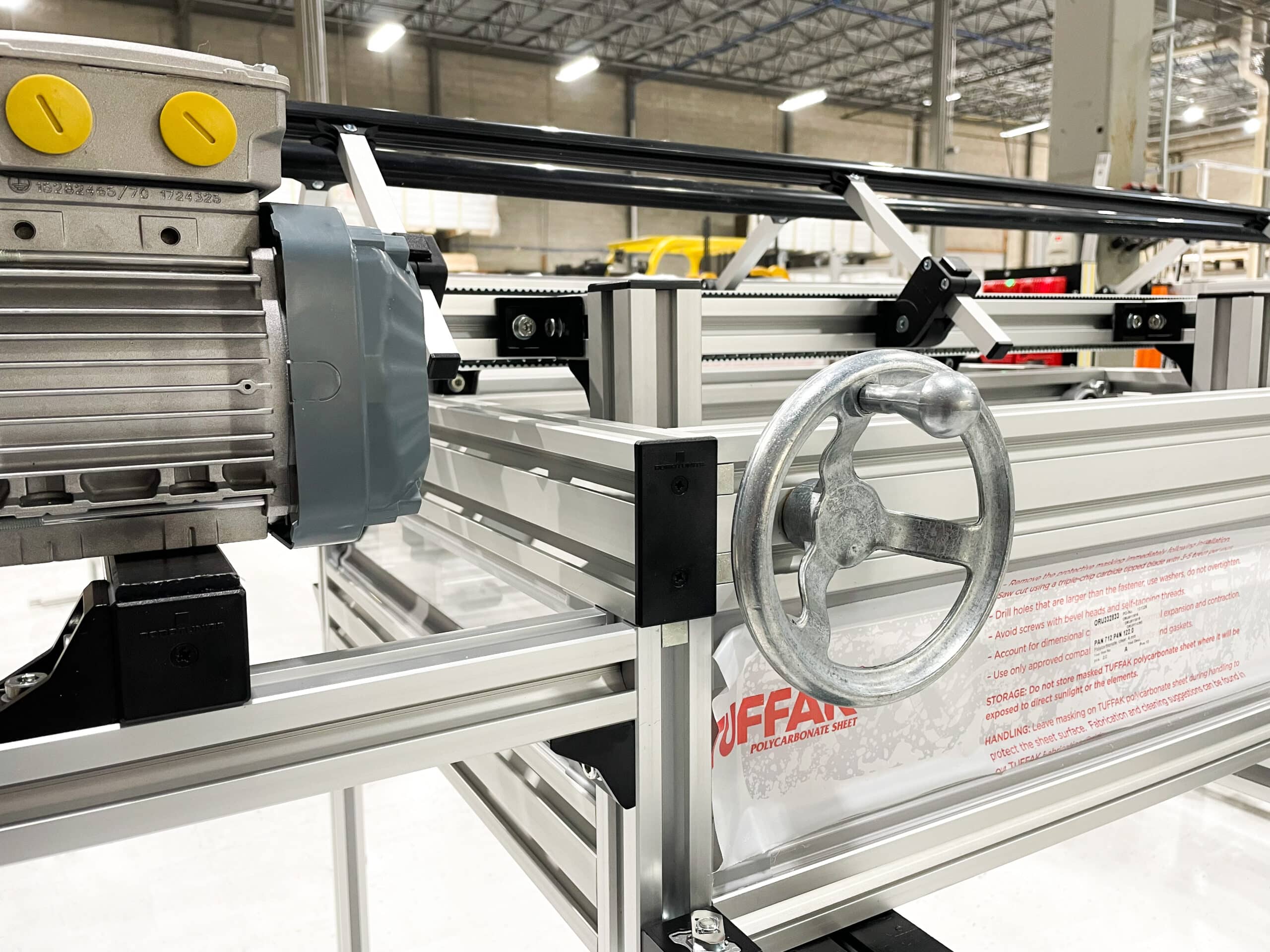 Smooth user adjustment. The customer specified two hand cranks so operators could raise or lower the conveyors, as well as adjust the conveyor widths to the corresponding bottle sizes. The components in the hand assemblies required excellent rigidity to ensure smooth motion. Our team responded with a 30-millimeter shaft that guides the Z-axis crank adjustability from the centerline, eliminating any binding and ensuring the conveyors remain straight during vertical motion.