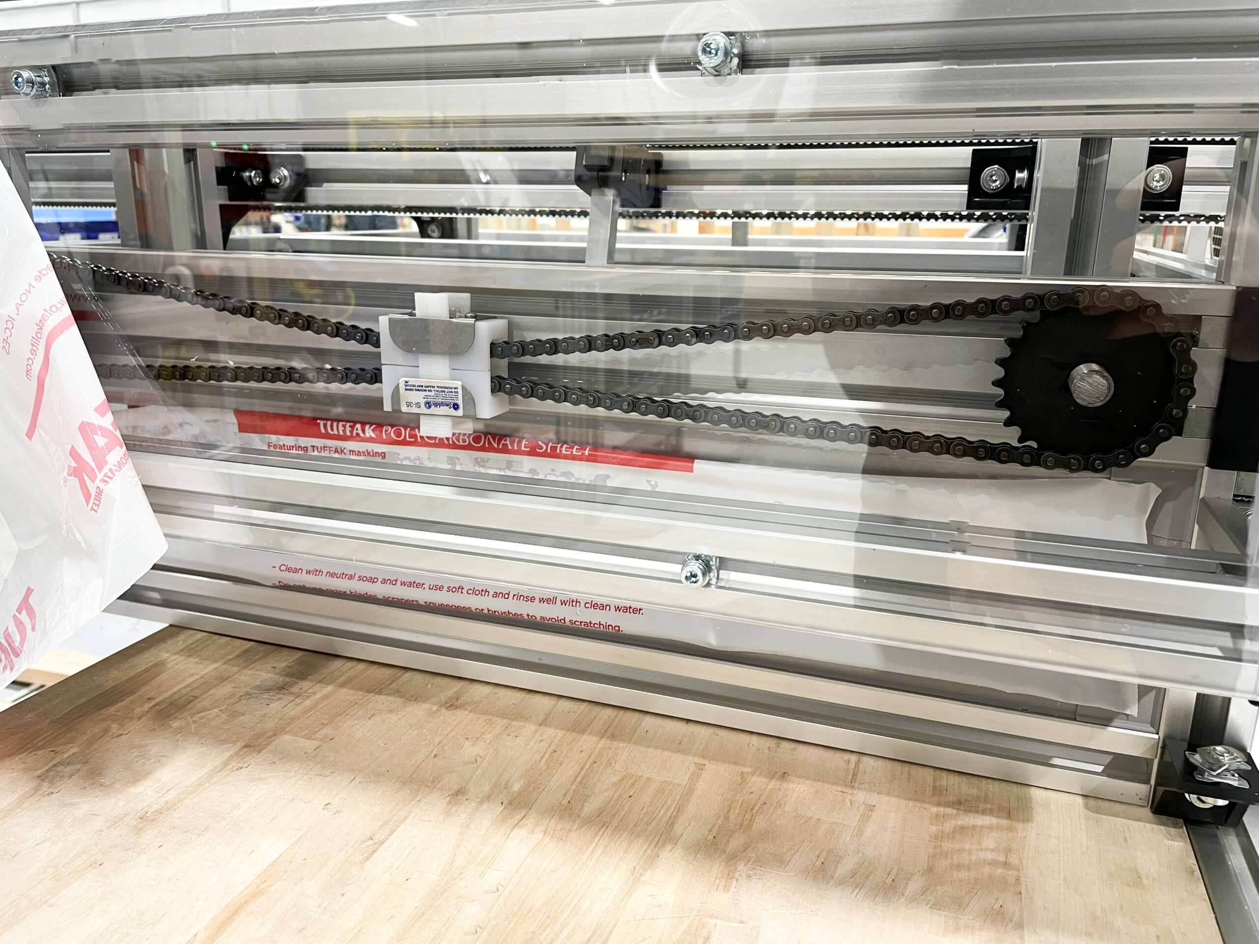 Space constraints. The preliminary design for the hugger conveyor section of the system called for a large frame to support the hugger conveyors. Due to space limitations, we explored a medium-size frame before opting for a four-legged frame with the hugger conveyors in the center of the assembly.