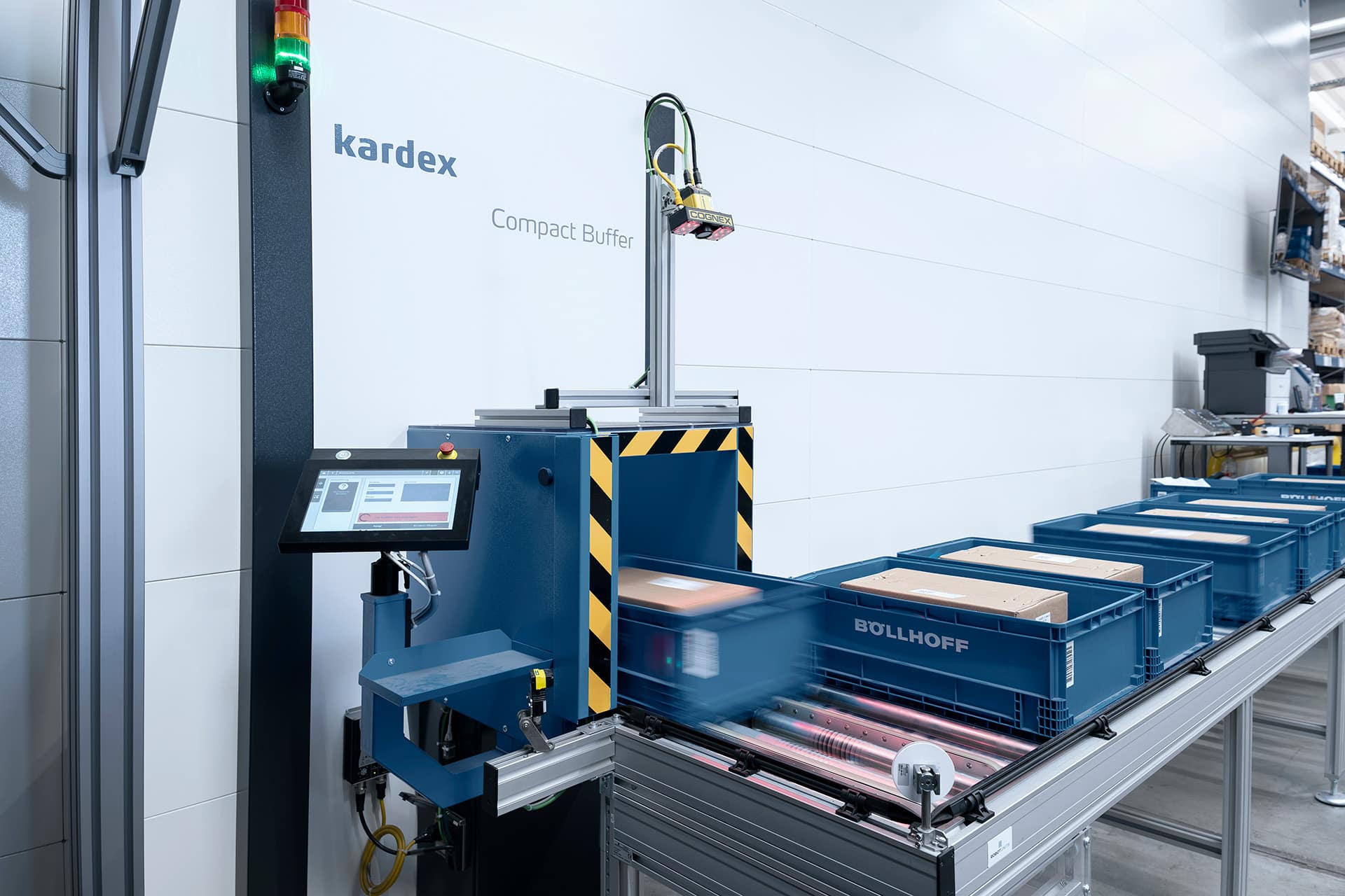 Um bei der Böllhoff Produktion GmbH sämtliche Transportprozesse an den Montageautomaten einfacher, schneller und flexibler zu gestalten, entschied sich das Unternehmen für die Investition in eine maßgeschneiderte Technologie mit vollautomatischer Lagerung durch ein Kardex System. Es besteht aus zwei Kardex Vertical Buffer Modulen mit je vier Bedienöffnungen und einer dazu passenden Fördertechnik-Konstruktion. Die Robotunits Rollenfördertechnik sorgt dabei für die automatisierte Bereitstellung der Artikel in KLTs. Diese werden dann bedarfsgerecht von einem FTS mit einem Robotunits Fördertechnik-Aufbau nahtlos übernommen und zum richtigen Montageautomaten transportiert.