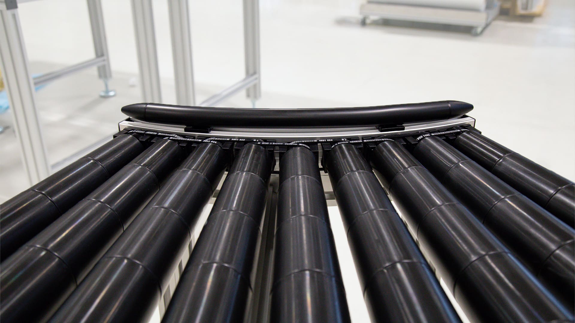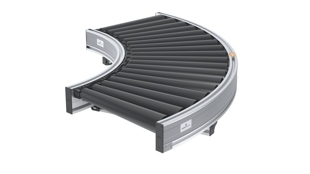Der Kurven Rollenförderer von Robotunits optimiert den lagetreuen Materialtransport um Kurven, ohne das Fördergut zu heben oder zu verschieben. Mit diesem System lassen sich Produkte reibungslos um 45° oder 90° bewegen. Durch das Hinzufügen weiterer Module sind auch Winkel von 135° bis zu 180° möglich.