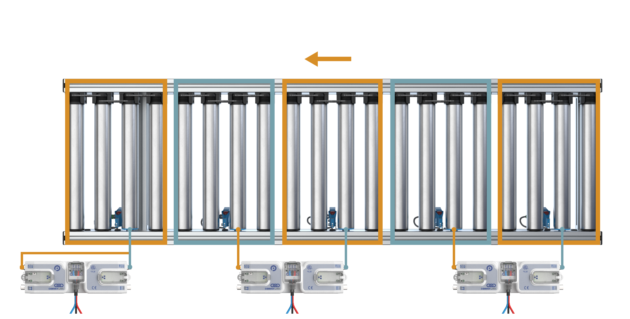 Der Controller erkennt, wenn es sich um eine lange Zone mit 2 Motorrollen handelt. Es sind dann auf dem Controller 2 Motorrollen und nur ein Sensor angeschlossen.